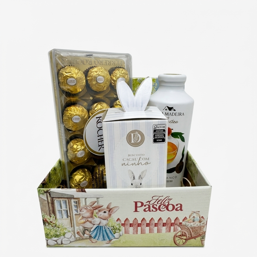 A Cesta de Páscoa Corporativa para Colaboradores – Florianópolis é uma opção delicada e acolhedora para presentear equipes na Páscoa. Em um mini display temático, reúne chá Casa Madeira Libertea, biscoito de Páscoa sabor cacau com ninho e bombom Ferrero Rocher, proporcionando um momento de pausa, cuidado e carinho no ambiente corporativo.
