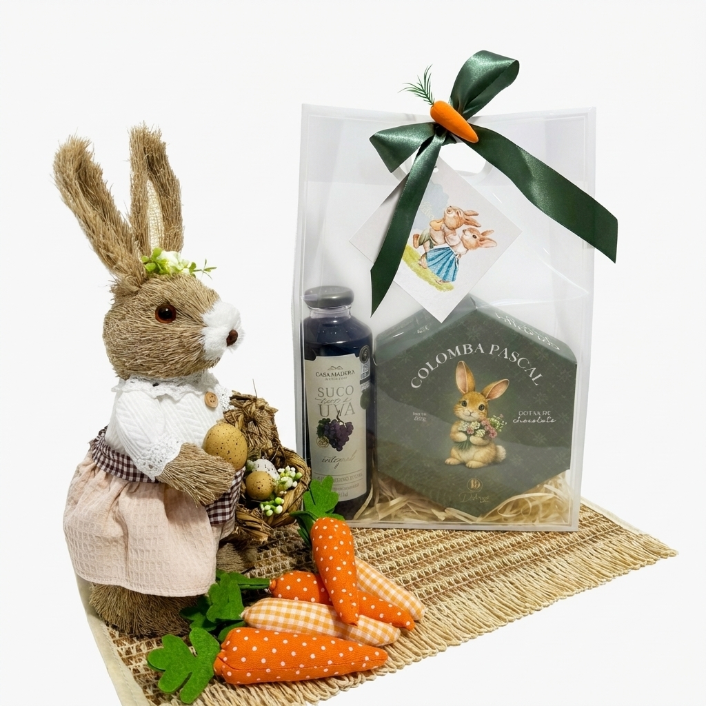 O Kit Presente de Páscoa para Empresas – Florianópolis é uma opção prática e elegante para ações corporativas. Em uma sacola transparente fosca premium, combina suco integral de uva Casa Madeira e colomba de Páscoa com gotas de chocolate, criando um presente delicado, saboroso e com ótima apresentação para colaboradores e clientes.